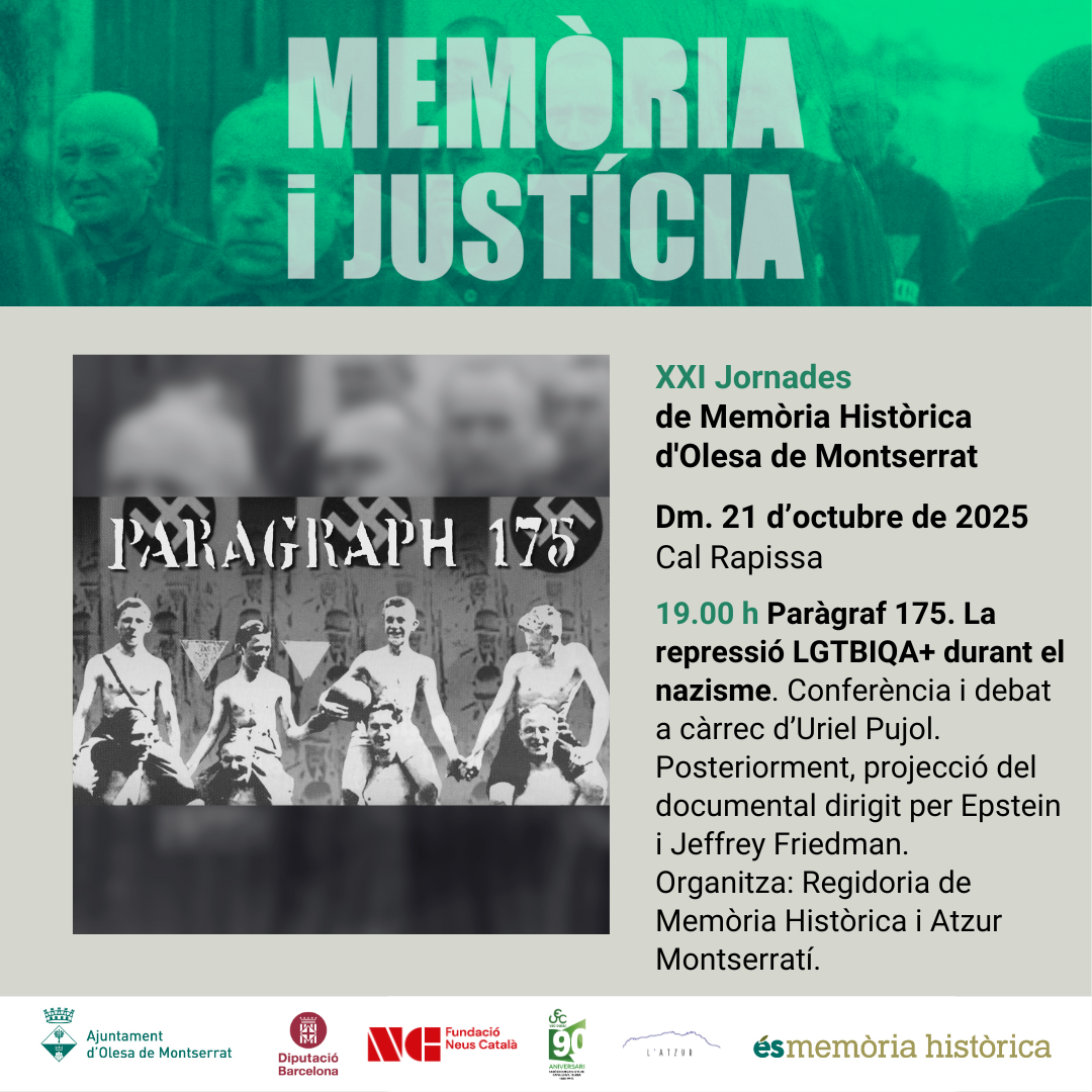 Conferència i debat sobre la repressió LGTBIQA+ durant el nazisme a càrrec d'Uriel Pujol, president de l'Atzur Montserratí. Posteriorment es projectarà el documental Paragraph 175, dirigit per Epstein i Jeffrey Friedman.