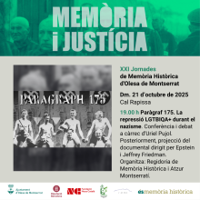 Conferència i debat sobre la repressió LGTBIQA+ durant el nazisme a càrrec d'Uriel Pujol, president de l'Atzur Montserratí. Posteriorment es projectarà el documental Paragraph 175...