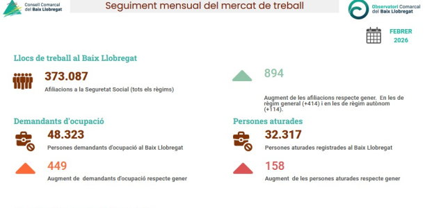L’Observatori comarcal actualitza les dades mensuals del mercat de treball del Baix Llobregat i destaca l’augment dels llocs de treball, dels demandants d’ocupació i de l’atur respecte gener de 2026.